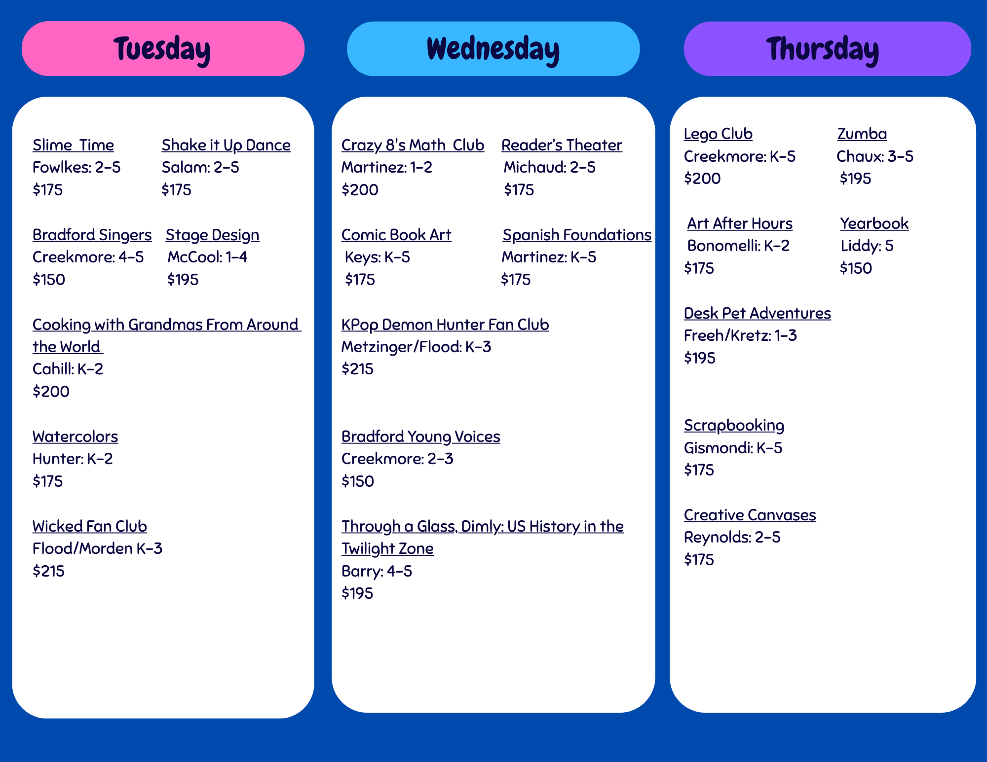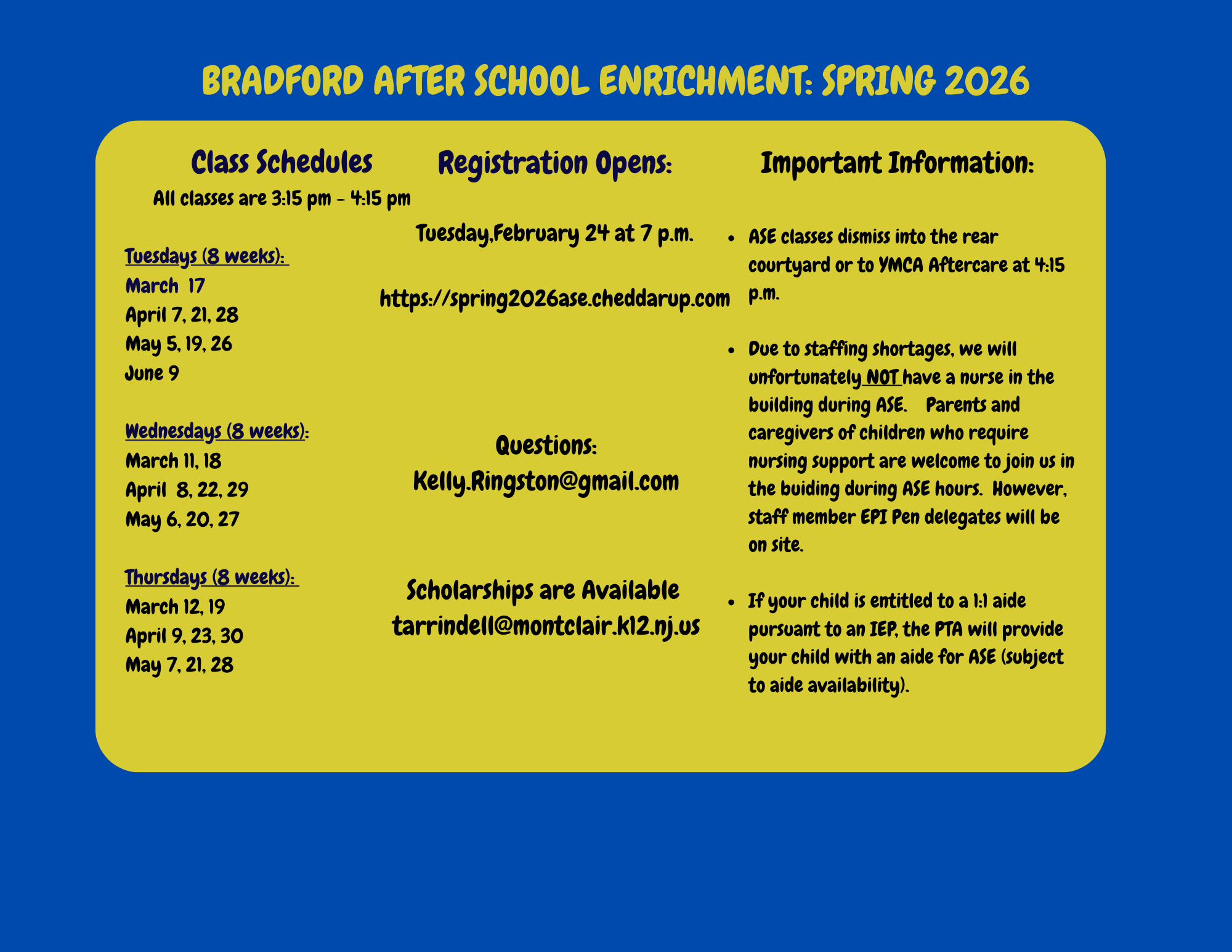 Set your reminders for ASE signups tonight at 7PM. It’s going to be a great season! From Bradford Singers & Young Voices to Spanish, Cooking, Wicked and K-Pop Demon fans, Lego Club, Comic Book Art, Zumba, Slime Time, and more! The Spring 2026 ASE will be eight sessions, starting March 11th, and the schedule is as below (please make note of these dates as there are some weeks that ASE will not take place): Tuesdays: March 17